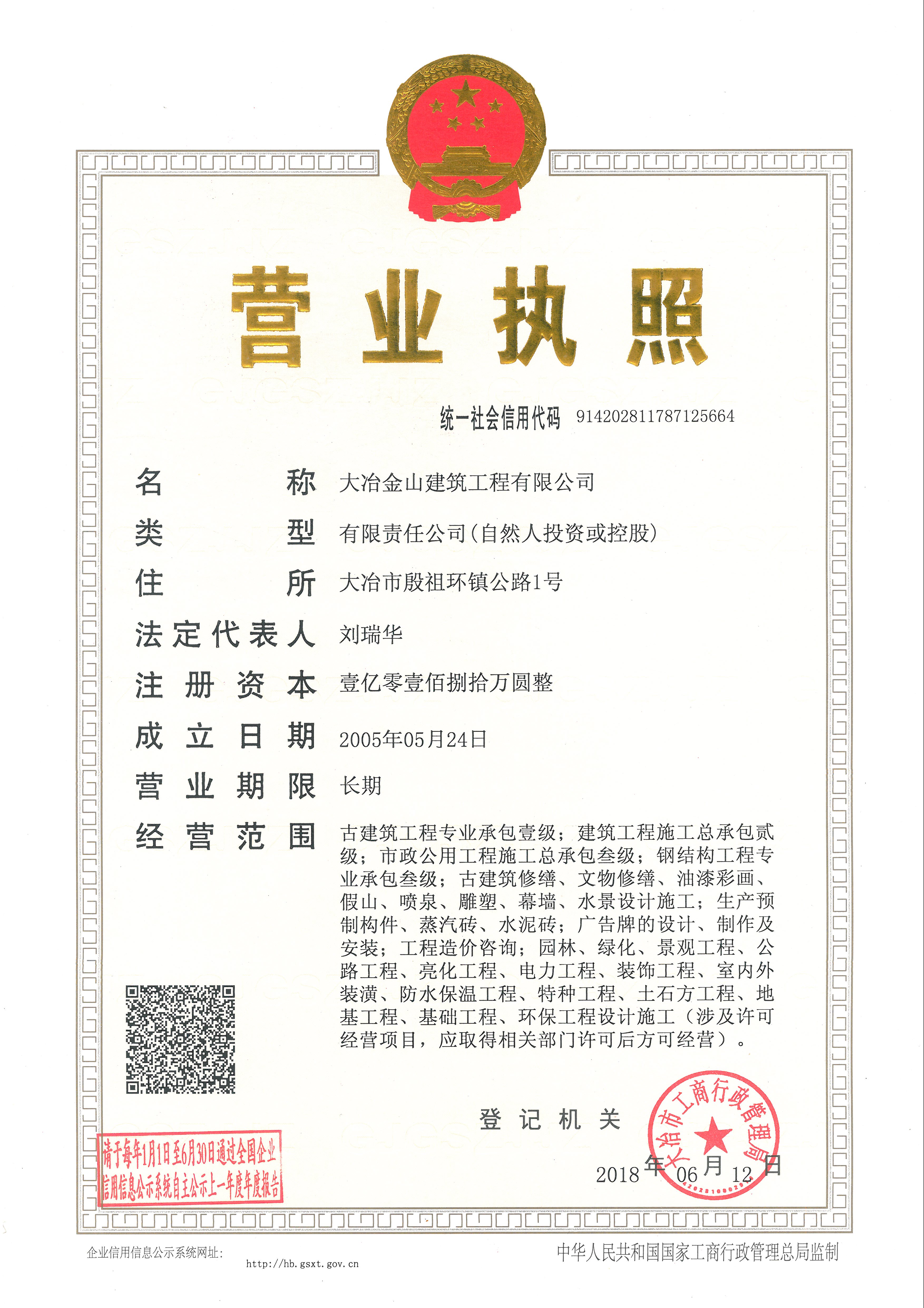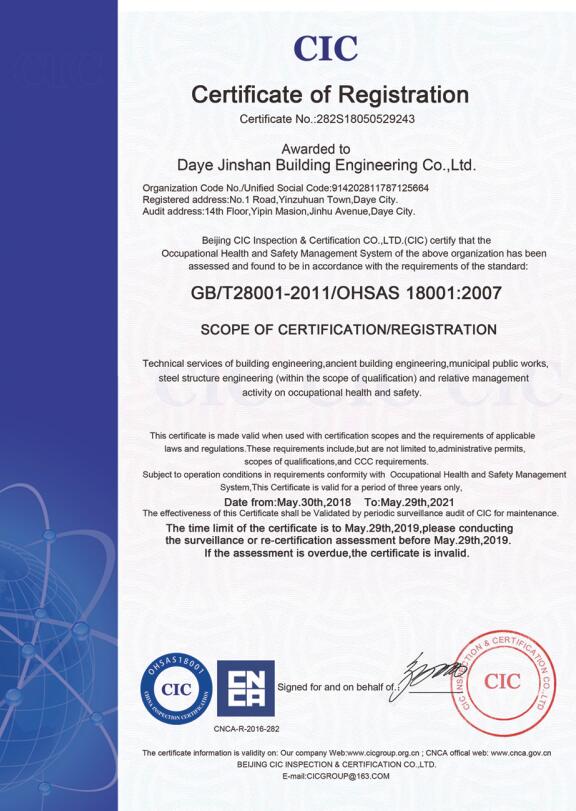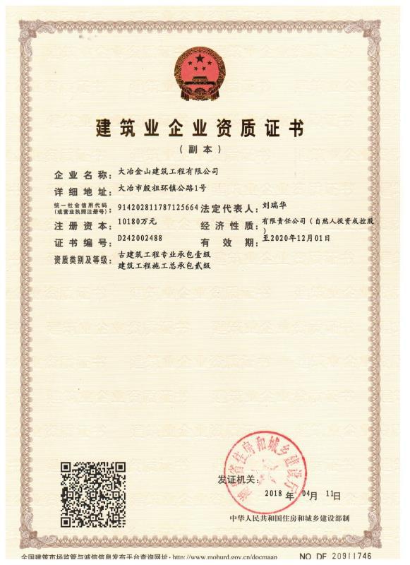 大冶金山建筑工程有限公司始建于1984年,屬鎮(zhèn)辦集體企業(yè)。1997年改制為大冶山建筑工程有限責(zé)任公司,屬股份制企業(yè)。2013年更名為大冶金山建筑工程有限公司,2018年3月公司資源重組,公司注冊(cè)資金達(dá)到10180.00萬(wàn)元,公司法定代表人為劉瑞華。公司具有古建筑工程專業(yè)承包壹級(jí)、建筑工程施工總承包貳級(jí)、市政工程總承包叁級(jí)、鋼結(jié)構(gòu)工程專業(yè)承包叁級(jí)資質(zhì)。